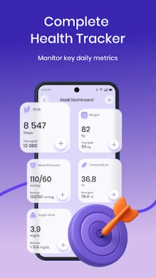 Users receive tools to track physical activity, set personal fitness goals, get tips, and view progress through graphs. All information is general wellness content and is not intended for clinical use.