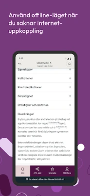 • Aktivera offline-läge för att få åtkomst till läkemedelsinformation även när din telefon/surfplatta saknar internetuppkoppling. I fältet längst ner på skärmen visas då information om att du använder appen offline och vilket datum den aktuella produkttexten senast laddades ned till din telefon/surfplatta.