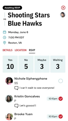- View your upcoming schedule, locations and times - Get directions to practices and games - Send messages to your team - RSVP to upcoming events and track attendance - Receive notifications for event reminders, schedule changes, and new messages